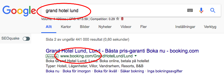 Om ni då inte köper ert eget namn eller namnet på produkten eller tjänsten ni marknadsför riskerar ni alltså att de kunder som har exponerats av er markadsföring i andra kanaler hamnar på konkurrenternas webbplatser.