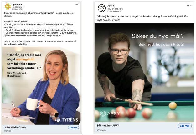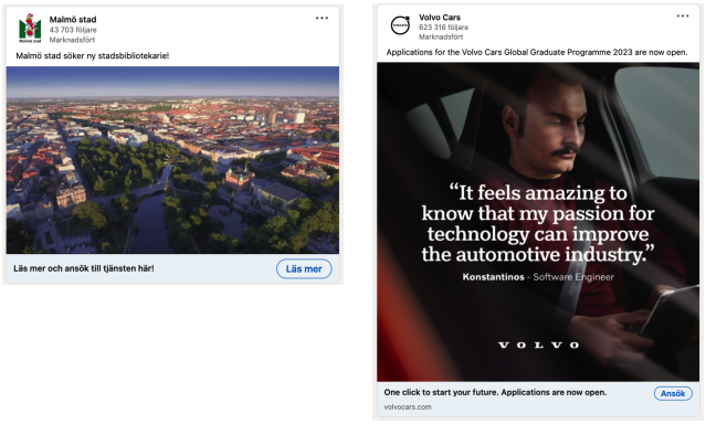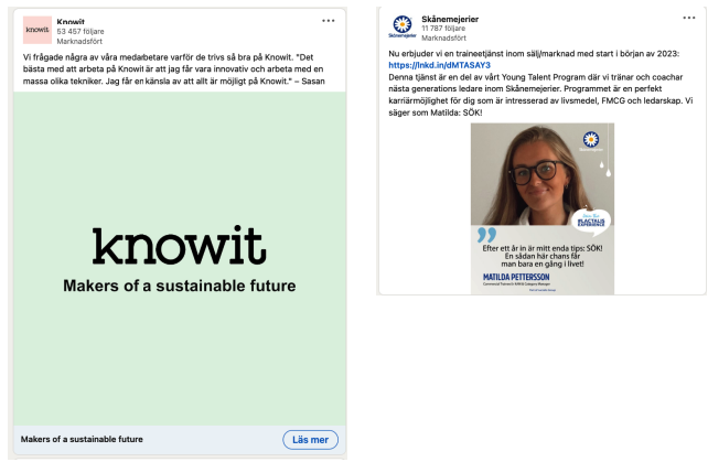 Här bjuder vi på några skärmdumpar på hur andra företag annonserar i sociala medier. Annonserna var aktuella under 2023.